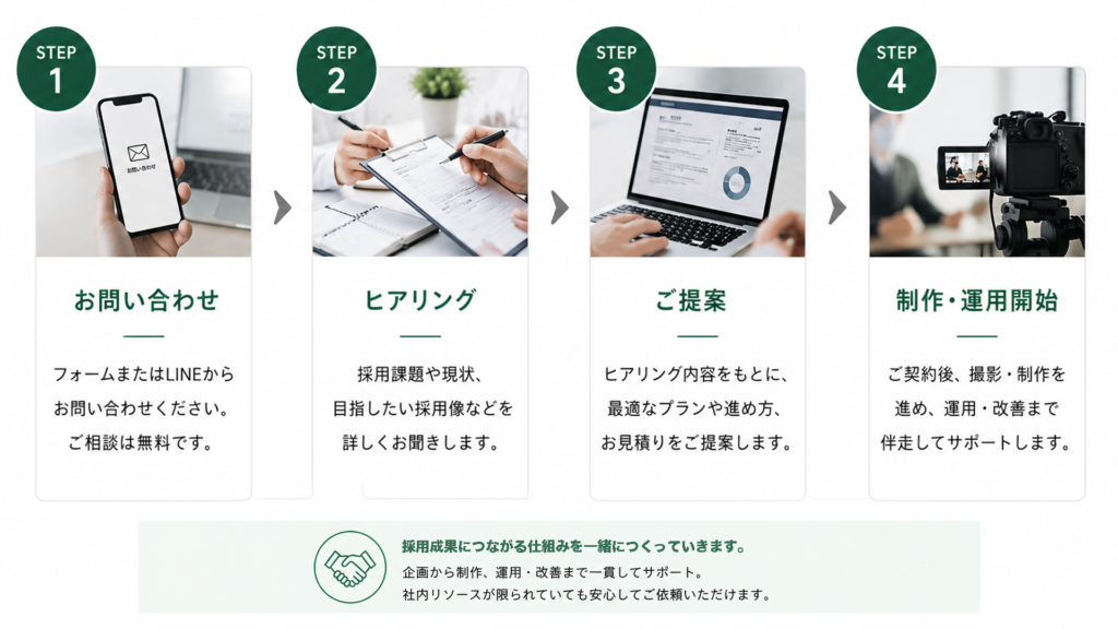 私たちは動画制作だけでなく、採用課題の整理・魅力の言語化・発信導線設計まで一緒に進めています。ただ作るだけでなく、採用成果につながる形を重視しています。