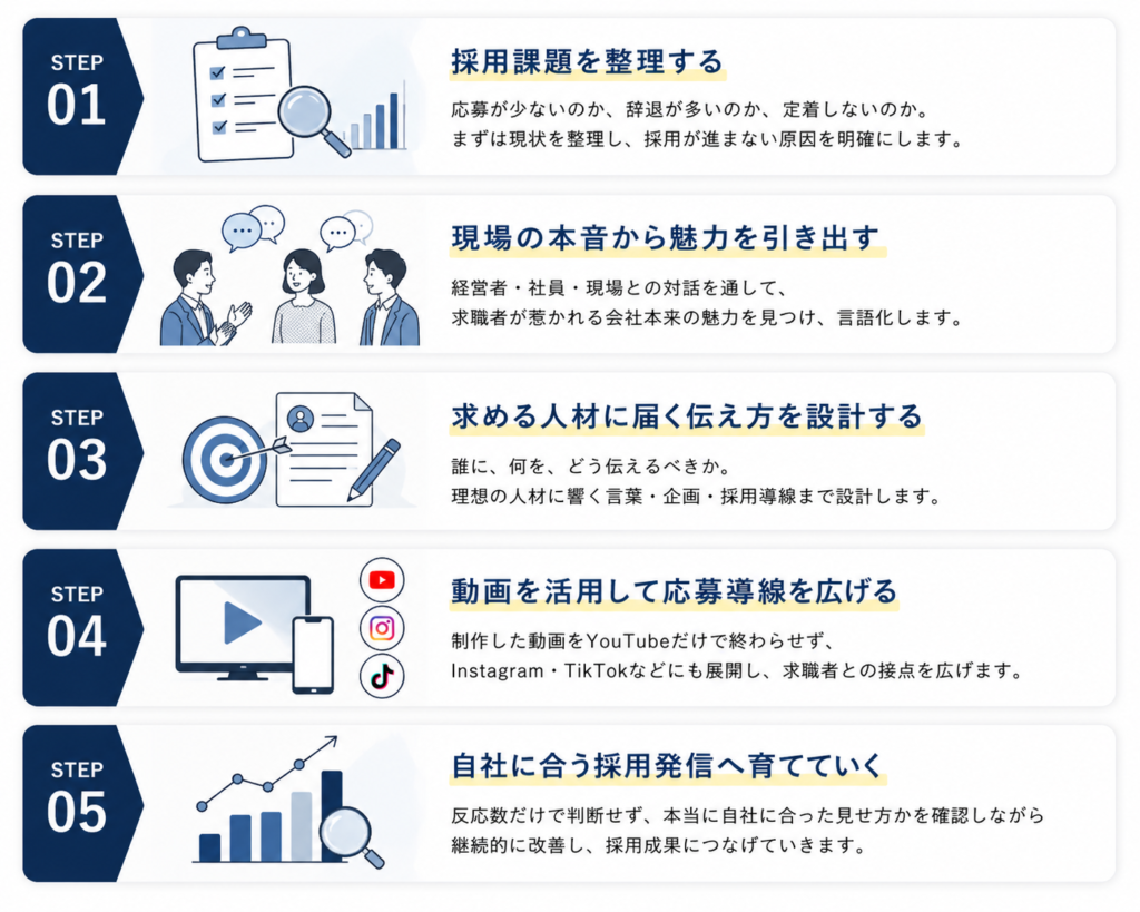 私たちは、採用課題の整理から、魅力の言語化・発信設計・改善提案まで、現場に入りながら一貫して進めていきます。